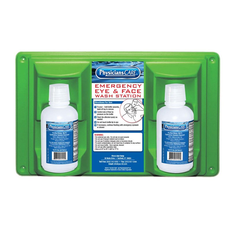 #242016C Eyewash Station with two 16 oz. Eyewash Solution Bottles, plastic wall mount station 16.5" long x 3.75" wide x 13.5" high. Items may vary slightly from images.